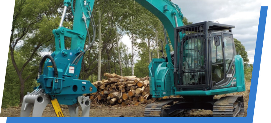林業仕様バックホ一本体の他、新商品や林業用アタッチメントも複数ご用意しており、その現場にあった商品をご提案する事が可能です。
