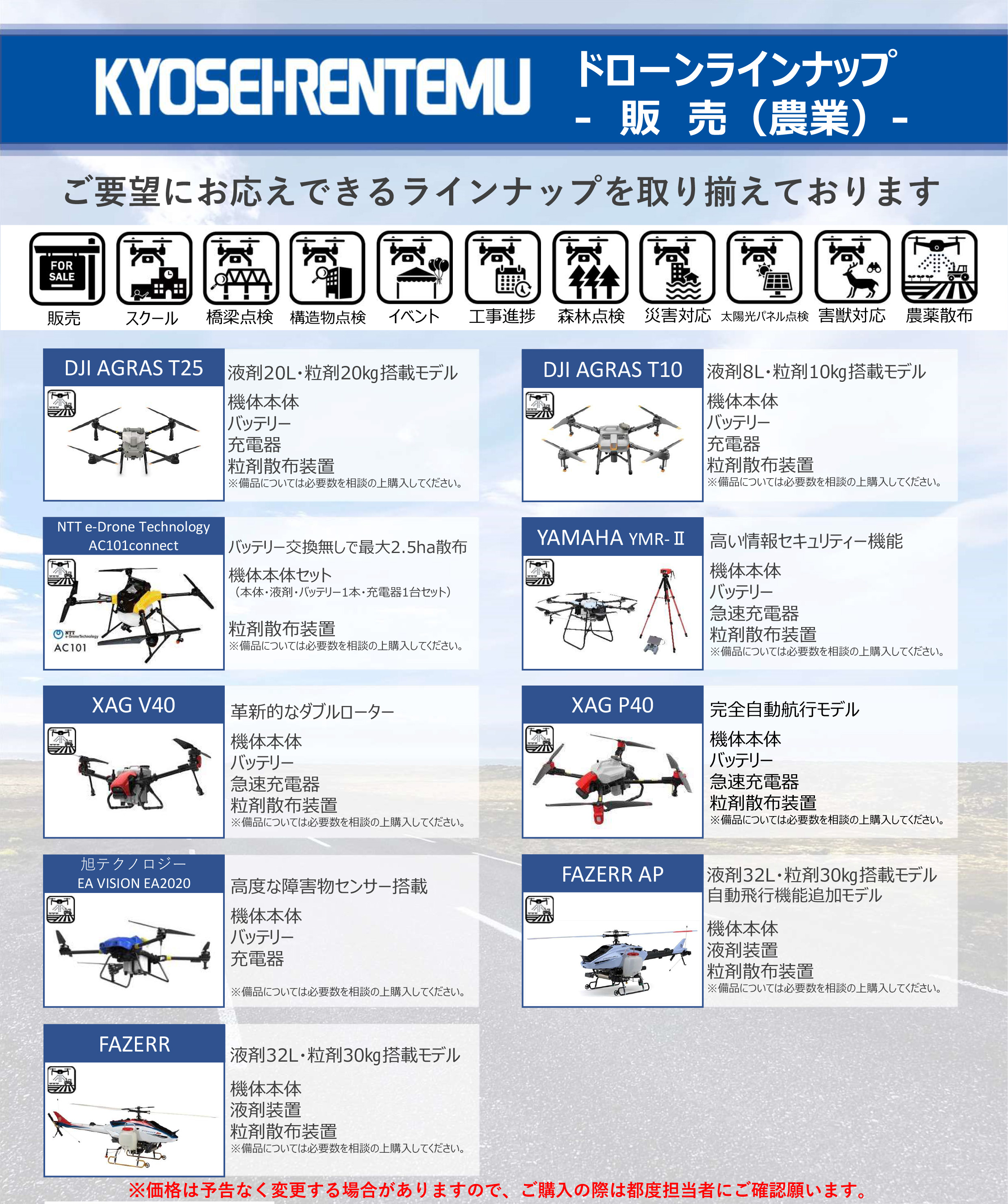ヤマハ発動機社製産業用無人航空機やDJI製無人機など、多数の選択肢の中から皆さまの用途にぴったりのドローンをご提案いたします。