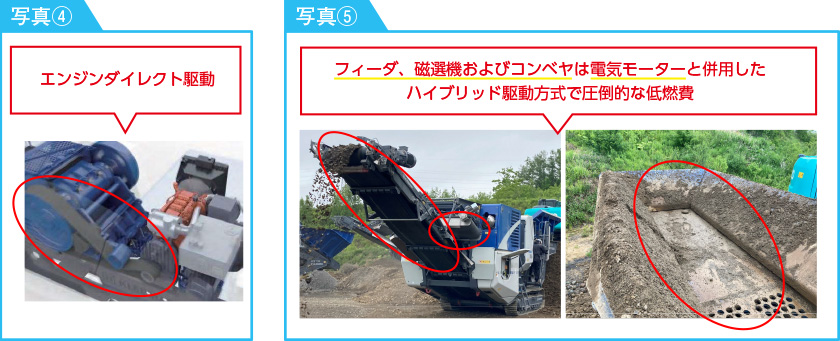 - 油圧機器削減(油圧使用は、クローラと歯板隙間調整のみ)による『メンテナンスコスト低減』を実現 ※写真⑤ ※油圧駆動の従来機に比べて約半分~1/3程度の燃費