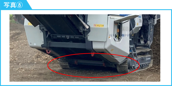 - クローラ内側の車高が低いため軟弱地を走行する場合や地盤が沈下する場所に設置の場合は敷き鉄板等の対応が必要 ※写真⑧