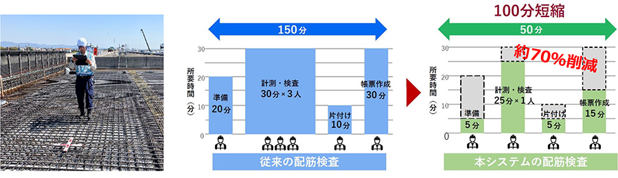 コンクリート構造物の配筋検査において、検査前の準備から計測、写真撮影・整理検査後の帳票作成までに必要な多くの時間と労力を削減します