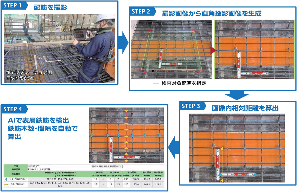 ✔鉄筋本数・鉄筋間隔・鉄筋径を瞬時に自動計測し、配筋検査の省力化・省人化を実現