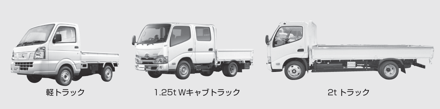| 呼称 | 軽トラック | 1.25tWキャブトラック | 2tトラック | 2tトラック Wキャブパワーゲート付き | 4tトラック | |