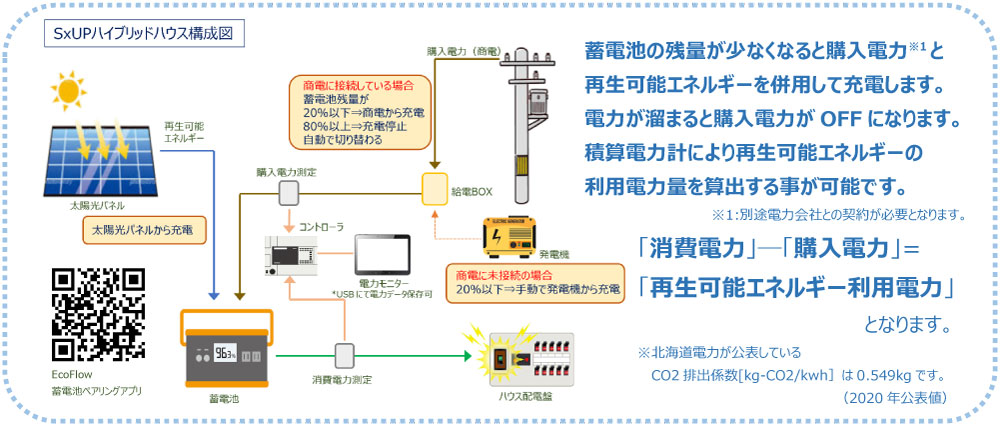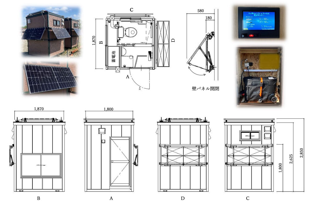 - 環境に配慮した再生可能エネルギー(solar)の有効利用と購入電力(Utility Power)も使用可能な利便性を兼ね備えたユニットハウス