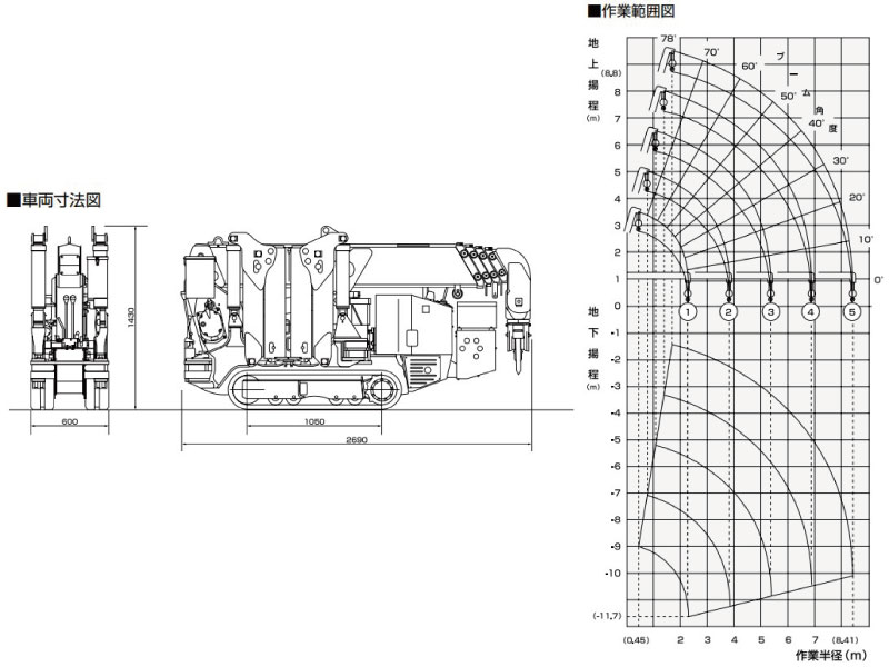 | 作業半径(m) | ~4.1 | 4.5 | 5.0 | 5.5 | 6.0 | 7.0 | 8.0 | 8.41 | ||||||||||||||||||||||||||||||||||||||||||||||||