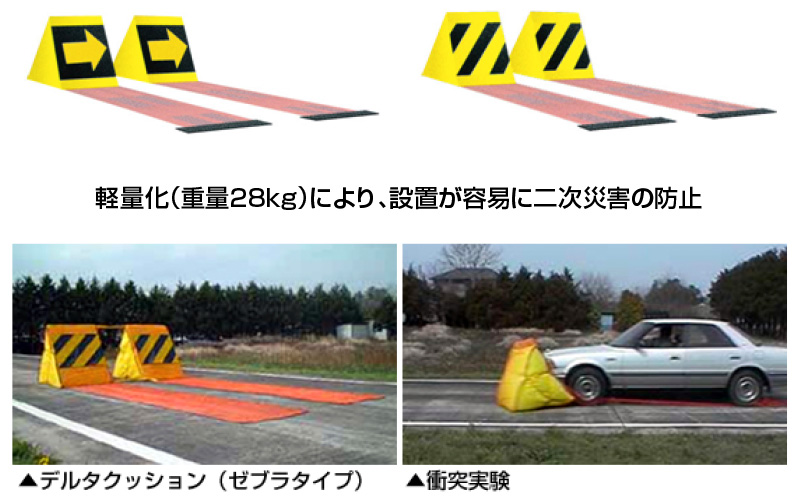 作業帯内に侵入もしくは侵入しようとする車両に対して緩衝体と衝突させる事によりドライバーに障害物として認識させブレーキをかけさせて停止を促します。
