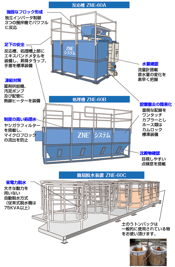 ③天然鉱物を主成分とした凝集剤を使用しており、最終処理ラインにヤシガラ濾過フィルター装備にて処理水質の向上を図るなど環境に配慮した設計となっております。