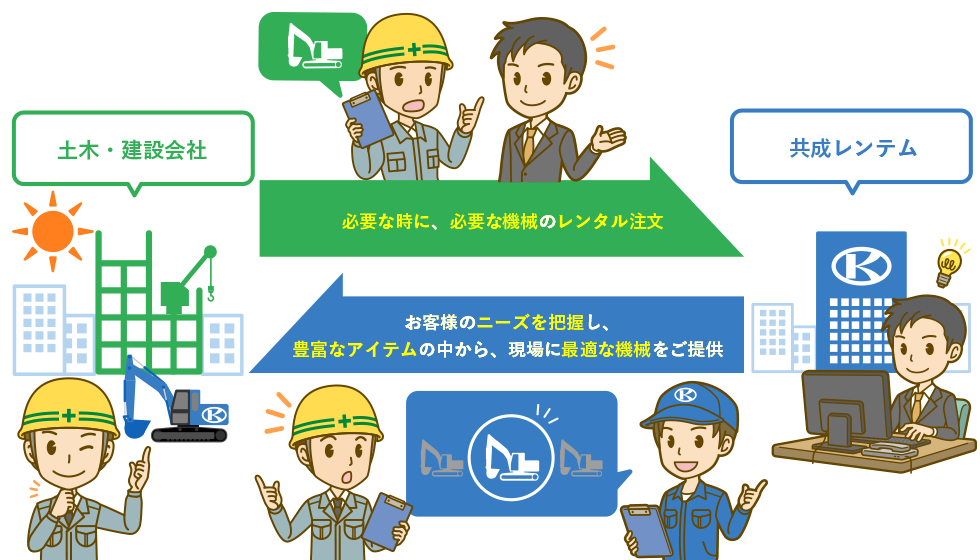普段、何気なく目にするビルやマンションの建築、道路やトンネル工事などの建設現場。そこで使われている建設機械は、これまでは土木・建設会社が自社で所有することが当たり前でした。しかし、現場の条件や工事内容によって必要な機械は変わってくるもの。建設機械の多様化や技術・工法の進歩の点から考えても、自社で建設機械を所有するより、共成レンテムのようなレンタル会社が所有する豊富なアイテムの中から必要な建設機械を必要な時にレンタルする方が、実はコスト的にみても、効率が良いのです。